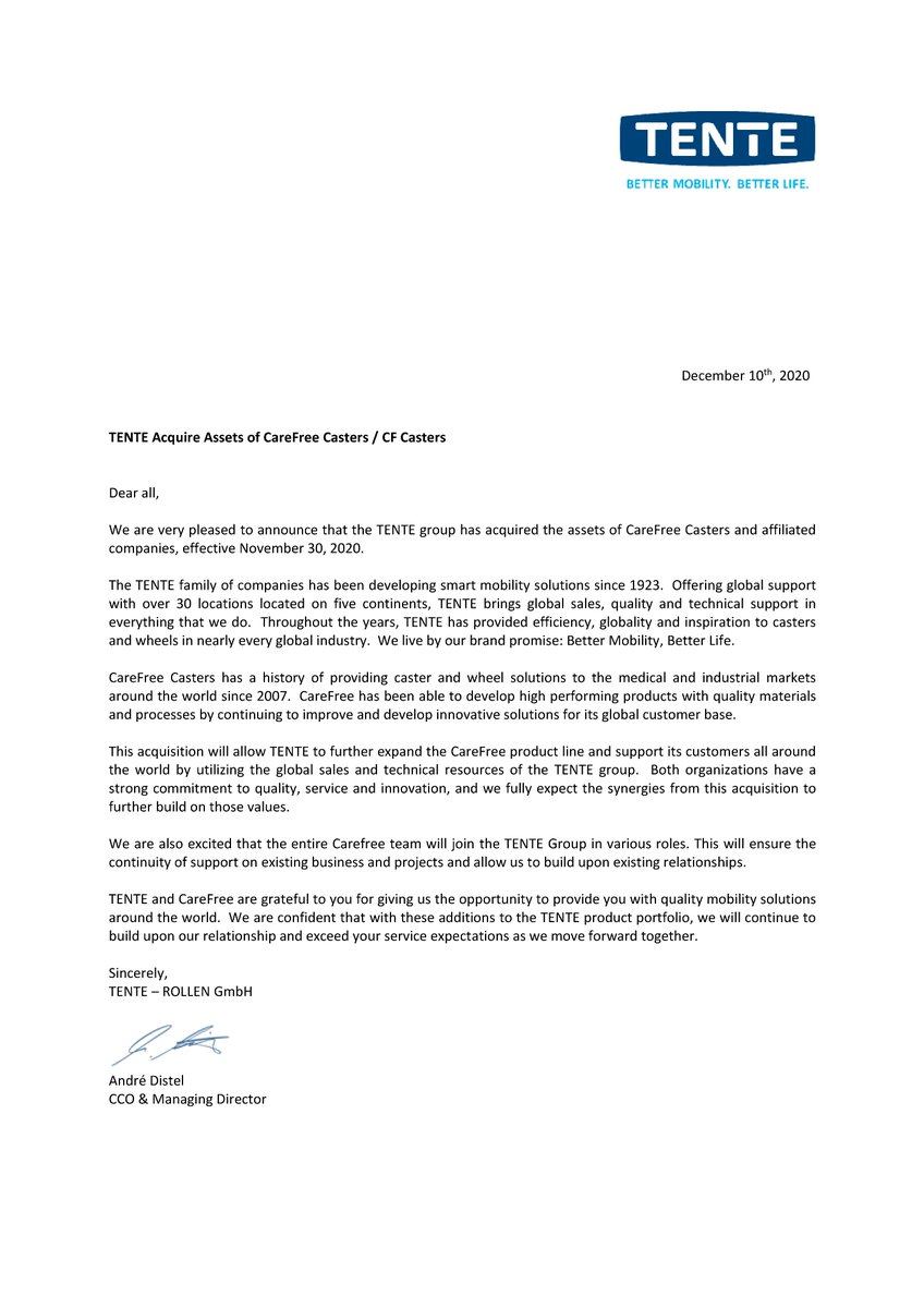 TENTEROLLEN was founded in this very setting back in 1923, in Wermelskirchen to be precise The firm’s core business was selling ball bearing casters and wheels for sliding cabinet doors Just a few years later, the company started its own production line. # Rollen # Räder We are very happy to announce a news from the TENTE world The TENTE Group has taken over the assets of CareFree Casters and associated companies with effect from November 30, Read more in the attached notice.