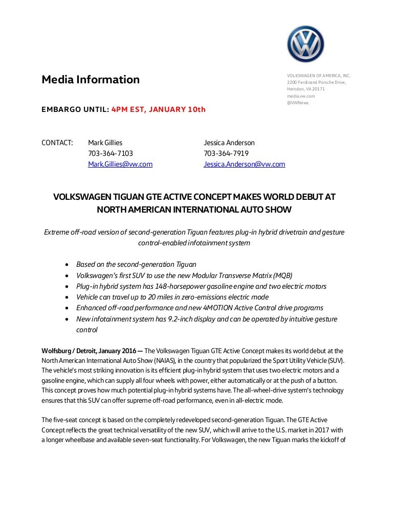 16 Detroit Auto Show Volkswagen Tiguan Gte Active Concept Gets Hybrid Power 4motion Ecolodriver