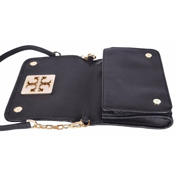 Description A Tory Burch Britten combo crossbody styled in soft bark pebbled leather with gold toned hardware Featuring a flap with magnetic snap closure, an adjustable chain, a removable crossbody strap, an interior zipper pocket, and 2 interior open pockets with a capacity of holding a small wallet, a phone, lipstick, and a makeup compact.