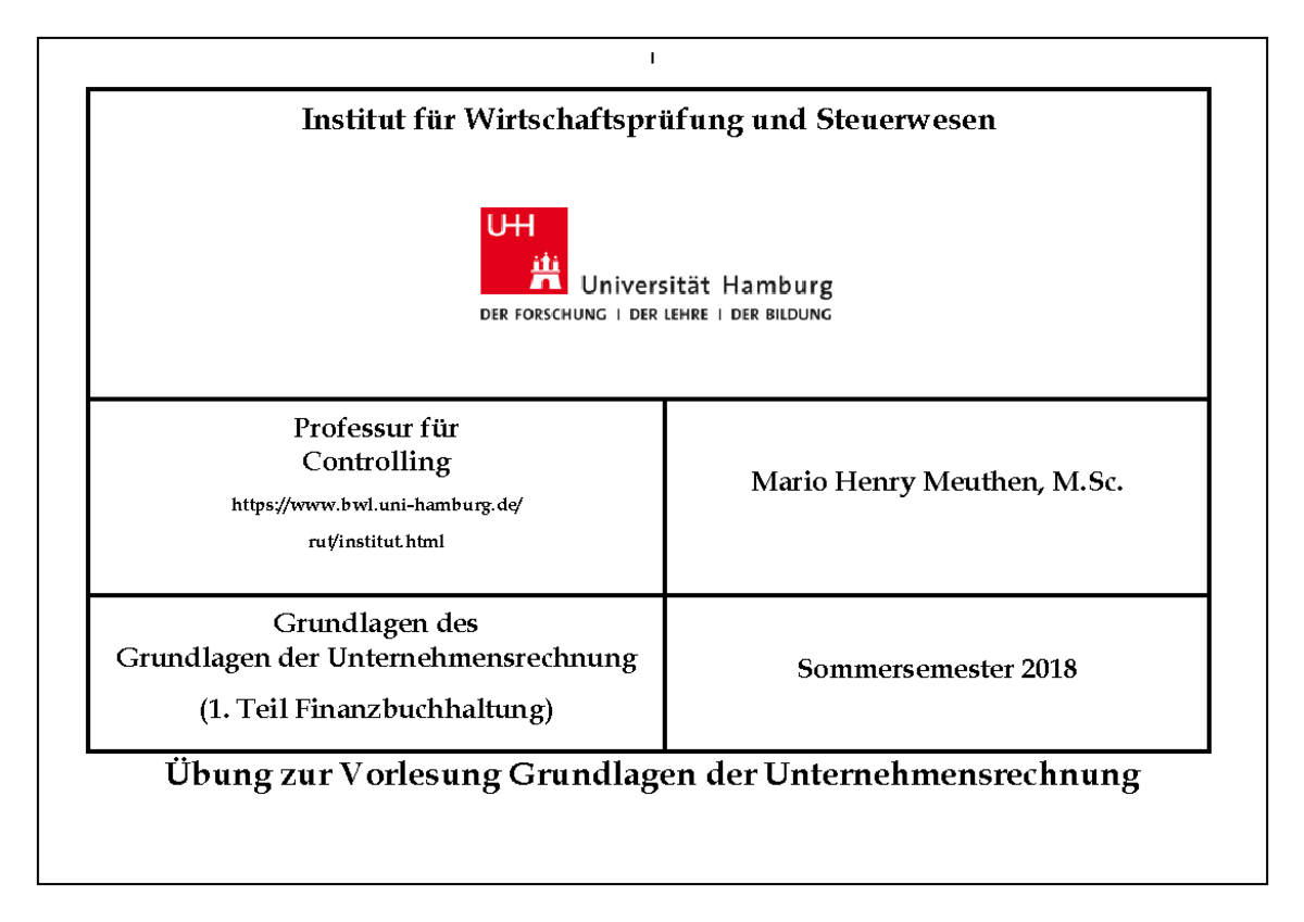 Ubung 01 Losung Grure Uhh Institut Und Steuerwesen Professur Controlling Mario Henry Meuthen Sc Grundlagen Des Grundlagen Der Unternehmensrechnung Studocu