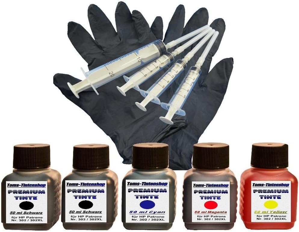 Premium Tinte Set Nachfulltinte 5 X 50 Ml Tinte Fur Patronen Hp 302 Black Und Color Plus 4 Nachfullspritzen Mit Nadeln Und 1 Paar Latexhandschuhe Amazon De Burobedarf Schreibwaren