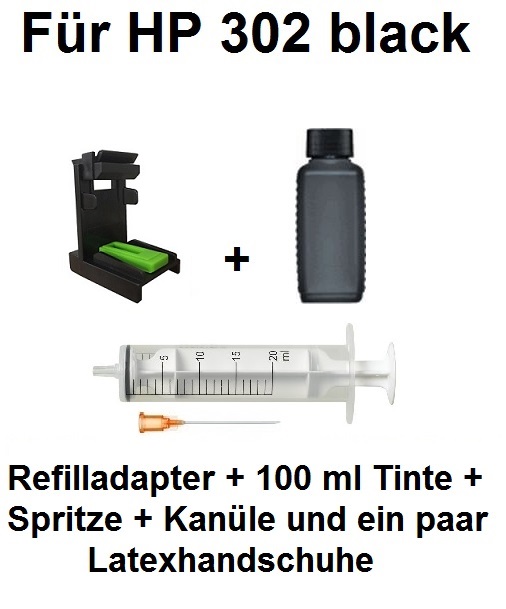 Tintenpatronen Nachfüllset 4 x 100 ml Premium RefillTinten für HP 302 und HP 304 black und color Je 100 ml black, cyan, magenta, yellow, mit Adapter, BefüllAnleitung, Zubehör Amazonde Bürobedarf & Schreibwaren. Nachfüllanleitung SCHWARZ für HP 302 / HP 302 XL Spritze mit Kanüle bestücken und 4 ml schwarze Tinte aufziehen 1 ml Tinte zurückspritzen, um Lufteinschlüsse zu vermeiden Spritze mit Kanüle ca 1,5 bis max 2,5 cm tief in eines der oberen Einfülllöcher einstechen und Tinte sehr langsam (etwa 1 ml pro 10 Sekunden) einspritzen. HP 302 F6U66AE Negro, Cartucho Original, de 190 páginas, para impresoras HP Deskjet serie 1110, 2100, 3600;.