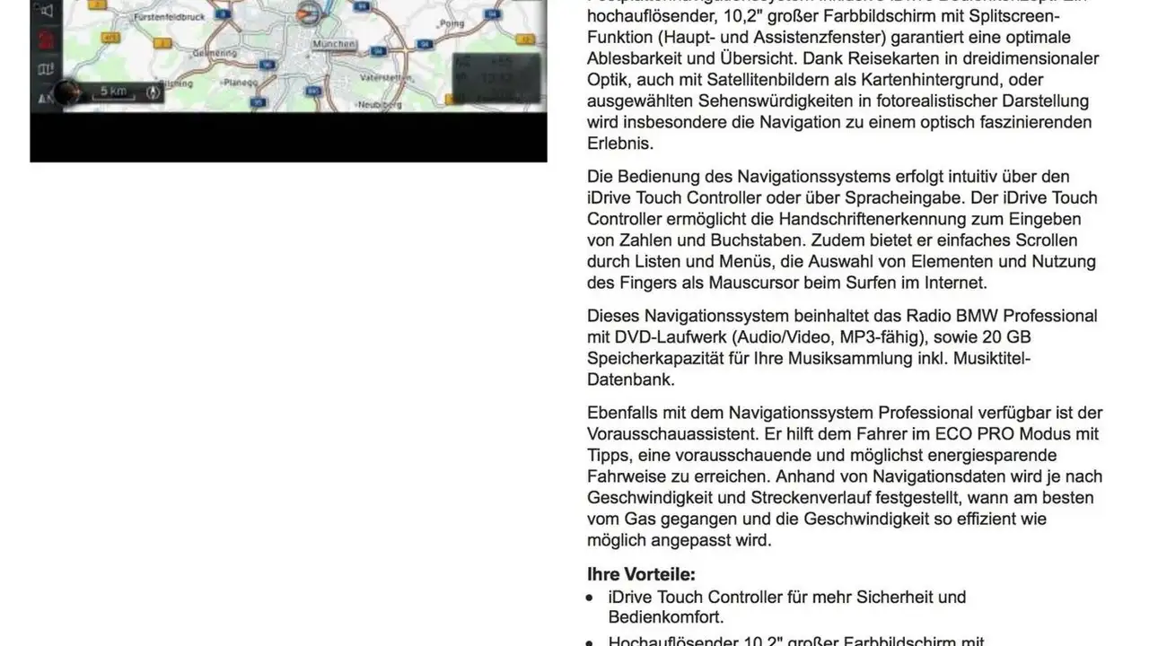 Das BMW Operating System 6.0 kann u. Das BMW Live Cockpit Plus mit Navigationsfunktion beinhaltet eine 5,7" große Instrumentenkombination im Instrumentenpanel, ein hochauflösendes touchfähiges Control Display mit 8,8" Bildschirmdiagonale und den iDrive Touch Controller auf der Mittelkonsole.