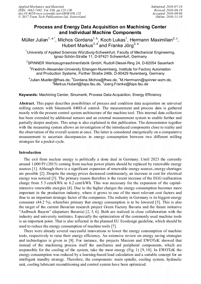 Process And Energy Data Acquisition On Machining Center And Individual Machine Components Scientific Net