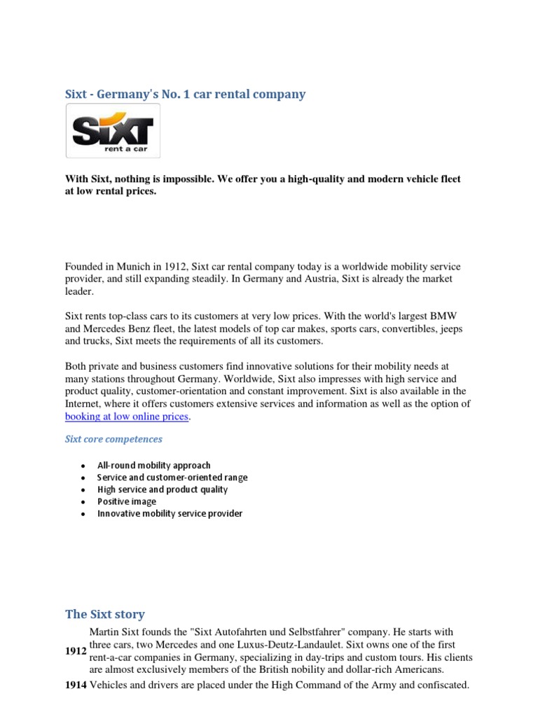 Emission Certifications EPA Off Highway Diesel. Now you can experience the benefits of a great car rental from Sixt both stateside and worldwide Familyowned and operated since 1912, Sixt rent a car began business with only three car rentals two Mercedes and a LuxusDeutzLandaulet Over the years, the Sixt family has turned their small startup business into an international sensation. Sixt AG is the German leader in the car rental segment and continues to expand throughout Europe Founded in 1912 as Sixt Autofahrten und Selbstfahrer by Mr Martin Sixt The company has approximately 1,400 branches in other countries, mainly in Europe, but also in Australia, New Zealand, Tunisia and Morocco, and now also in the USA.