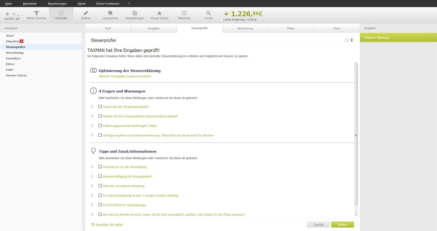 Lexware TAXMAN ist der digitale Steuerexperte, der dich durch die Erstellung der Steuererklärung zuverlässig begleitet und individuell berät Damit rechnest du alle benötigten Posten ab, reichst deine Belege oder aber auch Pauschalen ein und kannst dich auf eine maximal hohe Rückzahlung verlassen. Alle Jahre wieder kommt nicht nur das Christkind, sondern auch die Steuerklärung Bis zum 31Mai eines jeden Jahres müssen alle berufstätigen Steuerzahler die Steuererklärung des Vorjahres beim Finanzamt einreichen Die Einkommensteuererklärung macht zwar Mühe und ist kompliziert, kann sich aber richtig lohnen Im Jahr 12 bekam man im Durchschnitt 901 Euro zurückerstattet. TAXMAN professional berechnet sofort die voraussichtliche Erstattung oder Nachzahlung und zeigt Ihnen Veränderungen unmittelbar an Der Steuerprüfer weist Sie vor Abgabe auf fehlende oder unplausible Eingaben hin Mit der vorausgefüllten Steuererklärung (VaSt), und der Datenübernahme sowohl aus allen TAXMAN und QuickSteuerVarianten als auch aus dem ElsterFormular sparen Sie enorm viel Zeit.