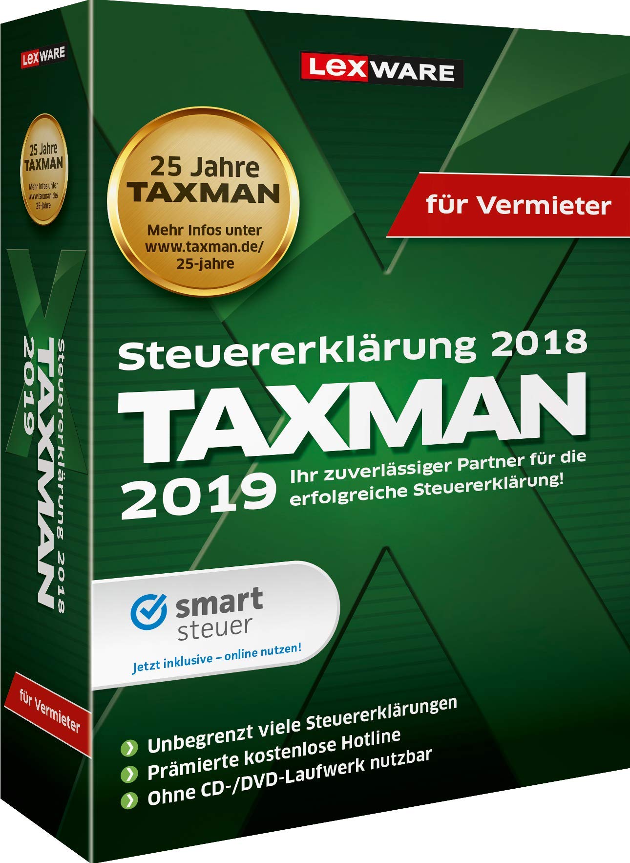 TAXMAN für Rentner und Pensionäre Jahresversion Empf VK € 29,33 ( € 34,90 inkl MwSt) TAXMAN für Selbstständige Jahresversion Empf VK € 29,33 (€ 34,90 inkl MwSt) TAXMAN für Vermieter Jahresversion Empf VK € 33,53 (€ 39,90 inkl MwSt) TAXMAN Für eine sichere & erfolgreiche Steuererklärung Zielgruppe. TAXMAN Datenübernahme aus dem Vorjahr Belegmanager für die komfortable Verwaltung und einfache Zuordnung von Belegen Vorausgefüllte Steuererklärung Druckfunktion und individuelle Schriftgröße Übertragung ans Finanzamt inkl digitaler Signatur via ELSTERSchnittstelle Ratgeberleiste mit persönlichen Hinweisen und Tipps, Vergleichsberechnungen, Handlungsanweisungen etc Steuertacho für. TAXMAN hat meine Steuererklärung in nur 25 Minuten erledigt und das, obwohl ich Neueinsteigerin bin Das Menü ist übersichtlich aufgebaut und die für mich wichtigen Formulare werden Schritt für Schritt bearbeitet Man erhält passende Tipps und Hilfen,.