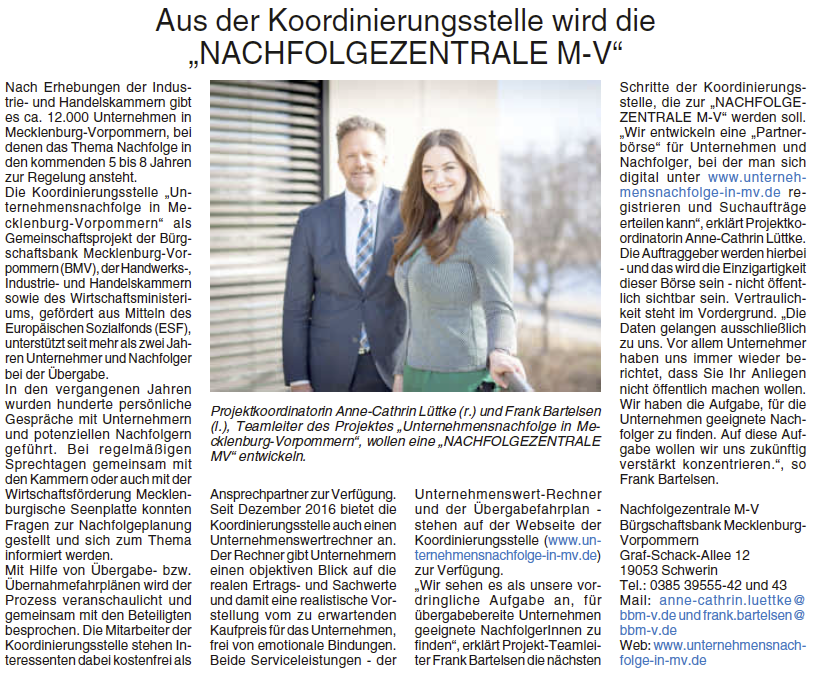 . Nr Nachfolgezentrale MV In MecklenburgVorpommern stehen in den nächsten Jahren über 100 Unternehmen zur Nachfolge an Nach Angaben des DIHKReports zur Unternehmensnachfolge 17 finden rund 44 Prozent der Unternehmer/innen keinen Nachfolger Ergänzt um die Handwerksbetriebe ohne. Um dieser Entwicklung entgegenzuwirken wurde Ende 15 die Unternehmensnachfolge in MV mit Mitteln des Europäischen Sozialfonds (ESF) als Kooperationsprojekt von der Bürgschaftsbank MecklenburgVorpommern GmbH (BMV) und dem Land MecklenburgVorpommern sowie den Industrie und Handelskammern und den Handwerkskammern im Land initiiert.