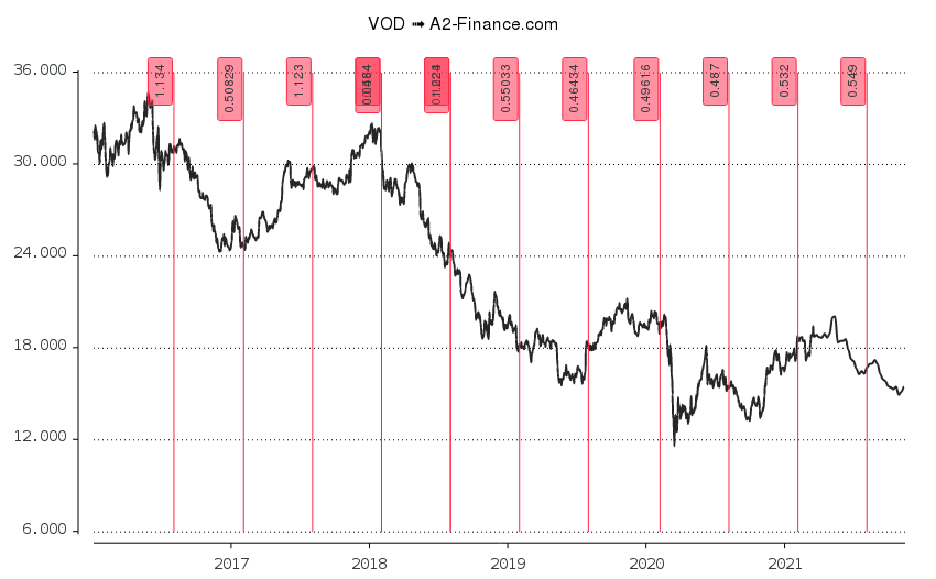 Wie oft ein Unternehmen im Jahr seine Dividende ausschüttet, kannst du unter anderem hier in meinem Blog sehen Bei den vom DividendenAlarm überwachten Dividenden Aktien, haben wir dir das Auszahlungsintervall mit aufgelistet DIV1 steht für eine jährliche Auszahlung, DIV2 zahlt halbjährlich aus, DIV4 sind die Quartalszahler und DIV12 ist ein monatlicher Dividendenzahler. Von Ende 16 bis Ende fiehl die Vodafone Aktie von 3,05€ auf 1,19€Auch die Dividenden stagnieren auf niedrigem Niveau bei 4,5 Eurocent pro Aktie pro Jahr Bei stabilen Umsätze bis 21 und sinkenden Gesamtkosten der Vodafone Group prognostizieren Analysten nun zu erwartende steigende Kurse In diesem Artikel beschäftigen wir uns mit der Vodafone Aktie. Ähnliche Themen Vodafone 5G Dividende.