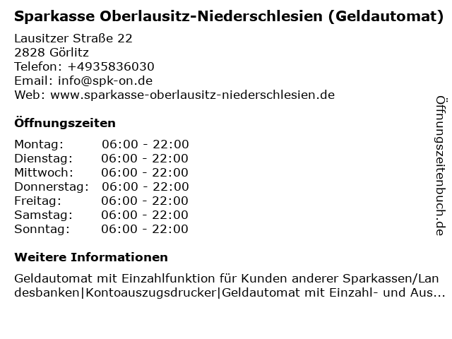 Aktuelle Öffnungszeiten der Sparkasse in Görlitz (Sachsen, 026) geöffnet Montags von 0Uhr bis 10Uhr, Dienstags von 0Uhr bis 10Uhr, Mittwochs von 0Uhr bis 10Uhr. Sparkasse Filiale Berliner Straße 64 026 Görlitz 0,67 km Sparkasse Filiale Reichenbacher Straße 53 / 55 027 Görlitz 1, km Sparkasse Filiale Lausitzer Straße 22 028 Görlitz 2,42 km. Für Sparkasse OberlausitzNiederschlesien in Görlitz, Neiße sind noch keine Bewertungen abgegeben worden Wenn Sie Erfahrungen mit diesem Unternehmen gesammelt haben, teilen Sie diese hier mit anderen Seitenbesuchern Geben Sie jetzt die erste Bewertung ab!.