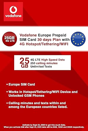 Vodafone Europa Vodafone 25gb 4g Lte High Speed Data Sim Karte Mit Hotspot Tethering Wifi Mit Bis Zu 4g Lte High Speed Prepaid 30 e Plan Data Promo Bis 23 September Amazon De Elektronik