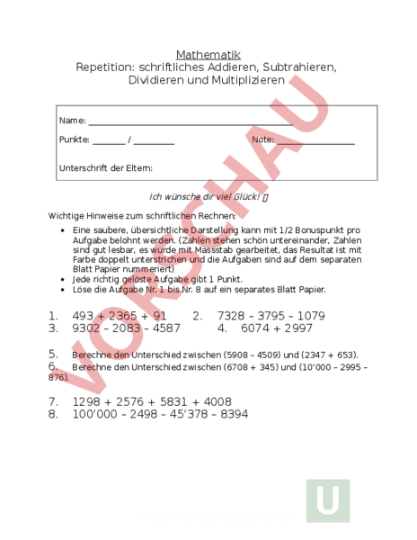 Arbeitsblatt Schriftliches Rechnen Kurztest Mathematik Schriftliches Rechnen