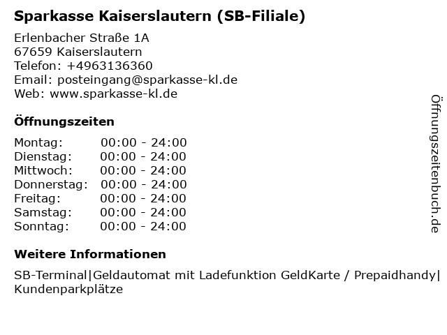 Stadtsparkasse Kaiserslautern, Geschäftsstelle Erlenbach Bewertungen, Artikel, Öffnungszeiten und Gemeinwohlbilanz Stadtsparkasse Kaiserslautern, Erlenbach Geschäftsstelle Erlenbach Erlenbacher Straße 1A Kaiserslautern Fon 0631 / Fax 0631 / info@sskklde. Stadtsparkasse Kaiserslautern, Geschäftsstelle Erlenbach Bewertungen, Artikel, Öffnungszeiten und Gemeinwohlbilanz Stadtsparkasse Kaiserslautern, Erlenbach Geschäftsstelle Erlenbach Erlenbacher Straße 1A Kaiserslautern Fon 0631 / Fax 0631 / info@sskklde. Hier finden Sie die Öffnungszeiten und Ausstattungsmerkmale der Kreissparkasse Kaiserslautern, Geldautomat Erlenbach Erlenbacher Straße 17 in Kaiserslautern.