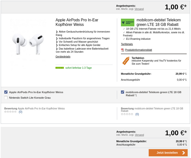 Weiterhin Verfugbar Apple Airpods Pro Fur 1 Euro Mit Telekom 18 Gb