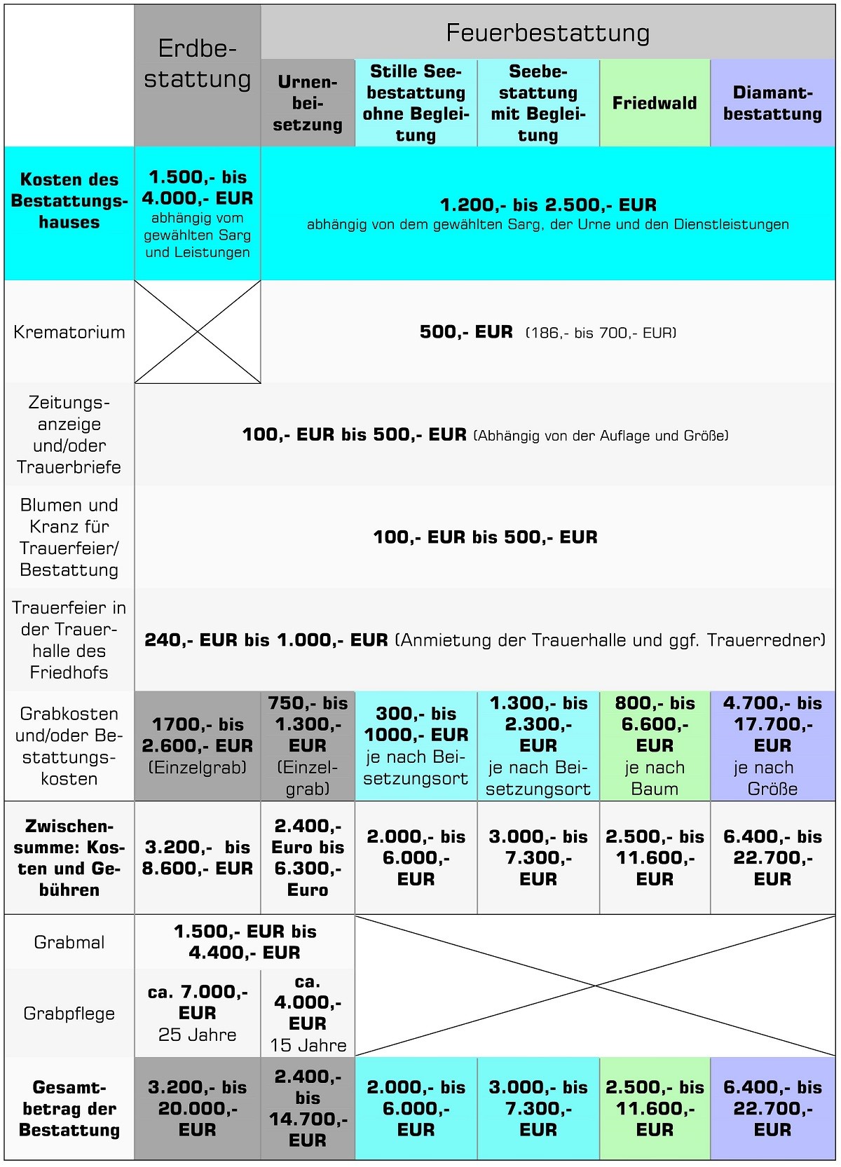 Auch ein naturbelassener und ökologisch unbedenklicher Vollholzsarg ist bereits im Basispreis enthalten Für die meisten Menschen ist es nicht von Bedeutung, ob ein Sarg aus Kiefern oder Eichenholz ist Der Sarg sollte ein Schutz und Transportmedium für den verstorbenen Körper darstellen Nicht mehr, aber auch nicht weniger. Eine Bestattung kostet 7600 EUR im Durchschnitt Die Beerdigungskosten richten sich nach Bestattungsart, Ort der Beisetzung (Friedhof), Grab, Umfang der erbrachten Leistungen des Beerdigungsinstituts, Grabstein (Steinmetz) sowie Grabpflege (Friedhofsgärtner) Eine günstigste anonyme Feuerbestattung kostet 00 EUR. Die Kosten für ein Grab hängen von der Lage, der Art des Grabes und dem Friedhof ab Wird die Grabstelle anlässlich eines Todesfalles erworben, so betragen die erstmaligen Kosten für zehn Jahre zwischen 945 und 1155 Euro für Sarggräber und 495 und 635 Euro für Urnengräber (Stand 1 1 11).