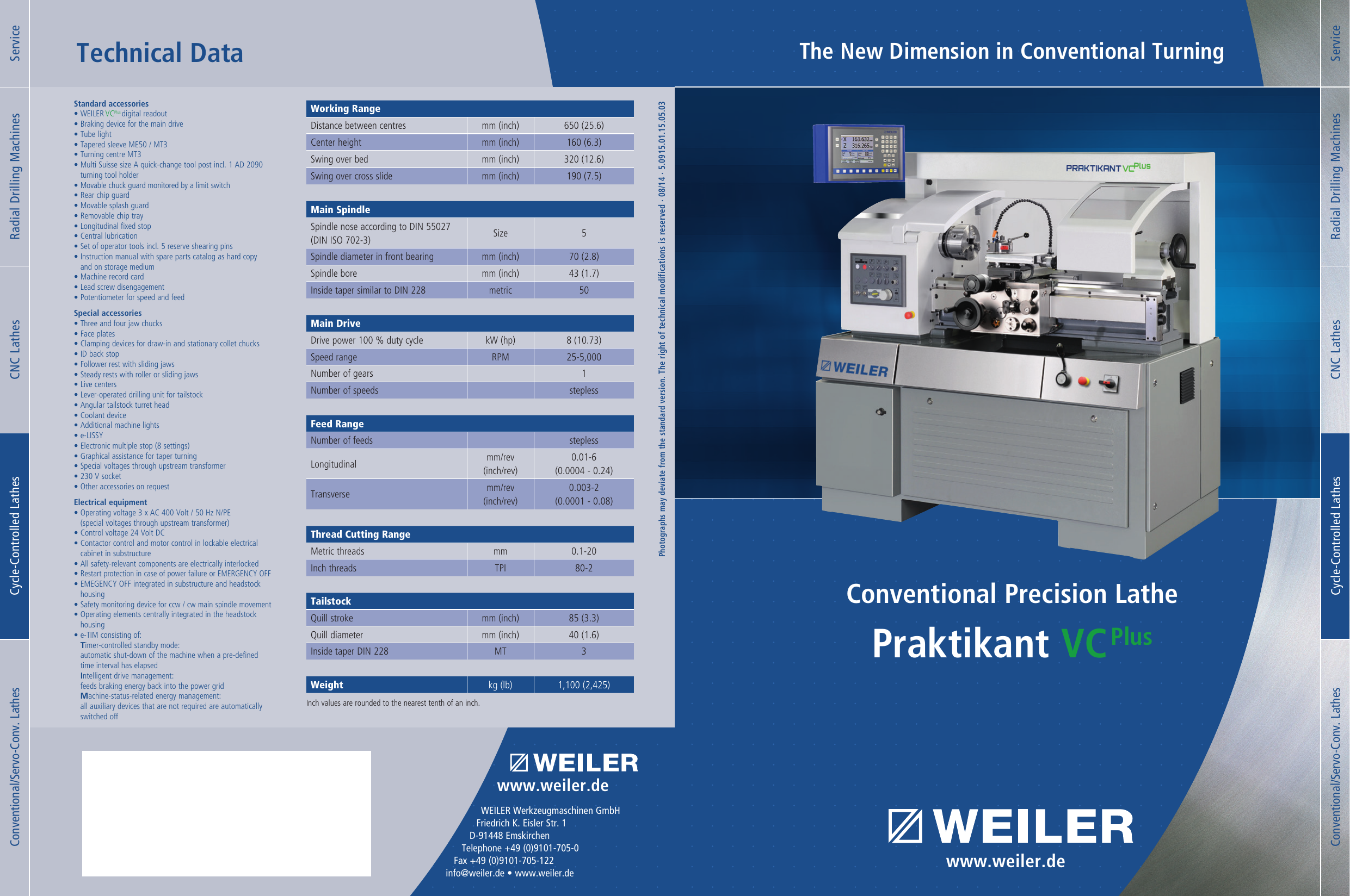 WEILER Werkzeugmaschinen Products (31) Other lathes (15) Manufacturer WEILER Werkzeugmaschinen GmbH Product group Other lathes Product designation V90 Technical Data Center distance 3000 100 mm Swing over bed 940 mm Speed range 1 900 1/min Drive power (60% / 100% ED). Warmelin Precision Products is an industrial supplier of cnc, cnc horizontal, cnc lathes, cnc machines, cnc machining, cnc milling, cnc milling and turning, cnc milling centers, cnc software, cnc turning. Download our product catalogue now freeofcharge from the download area pdf 25 MB.