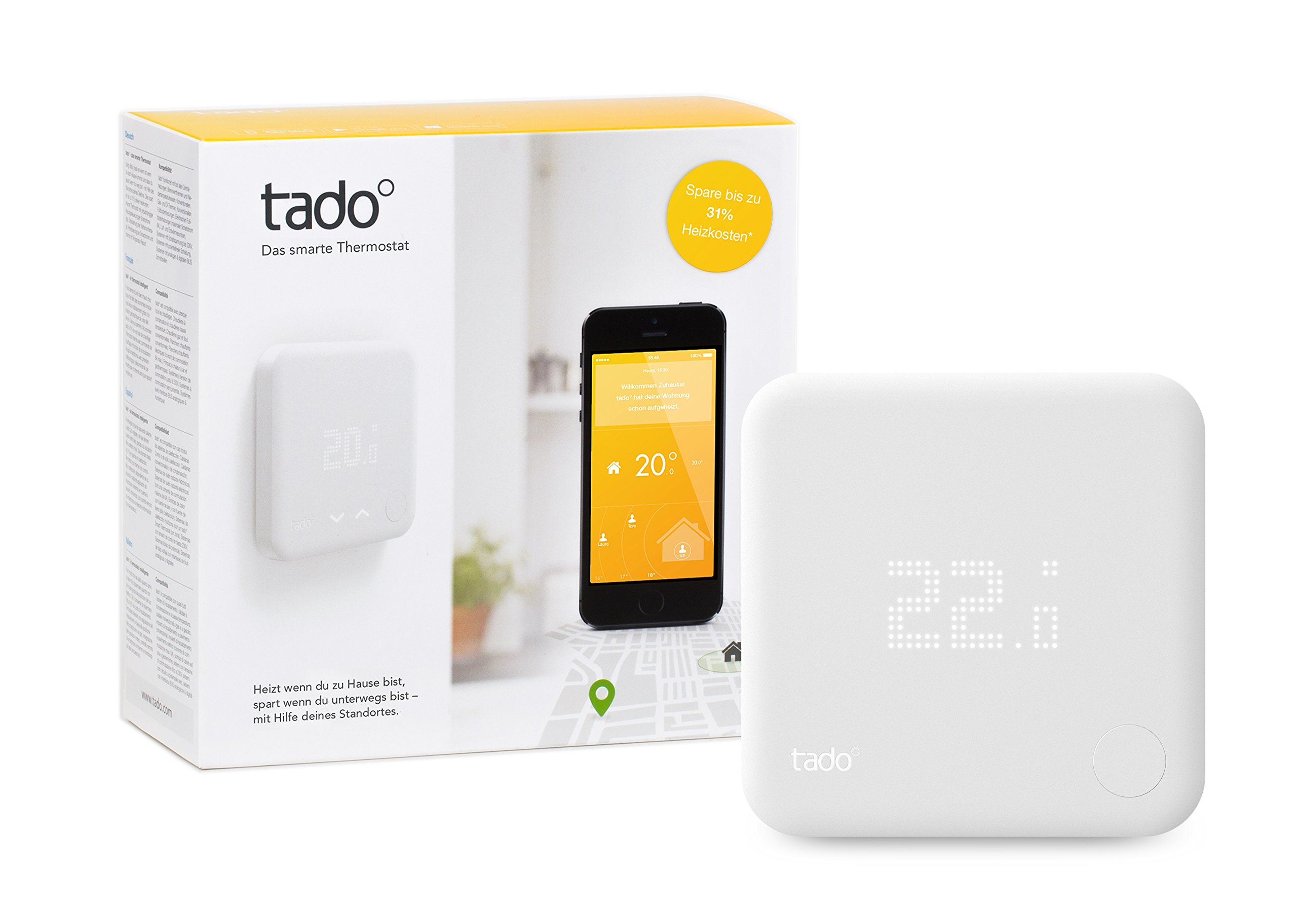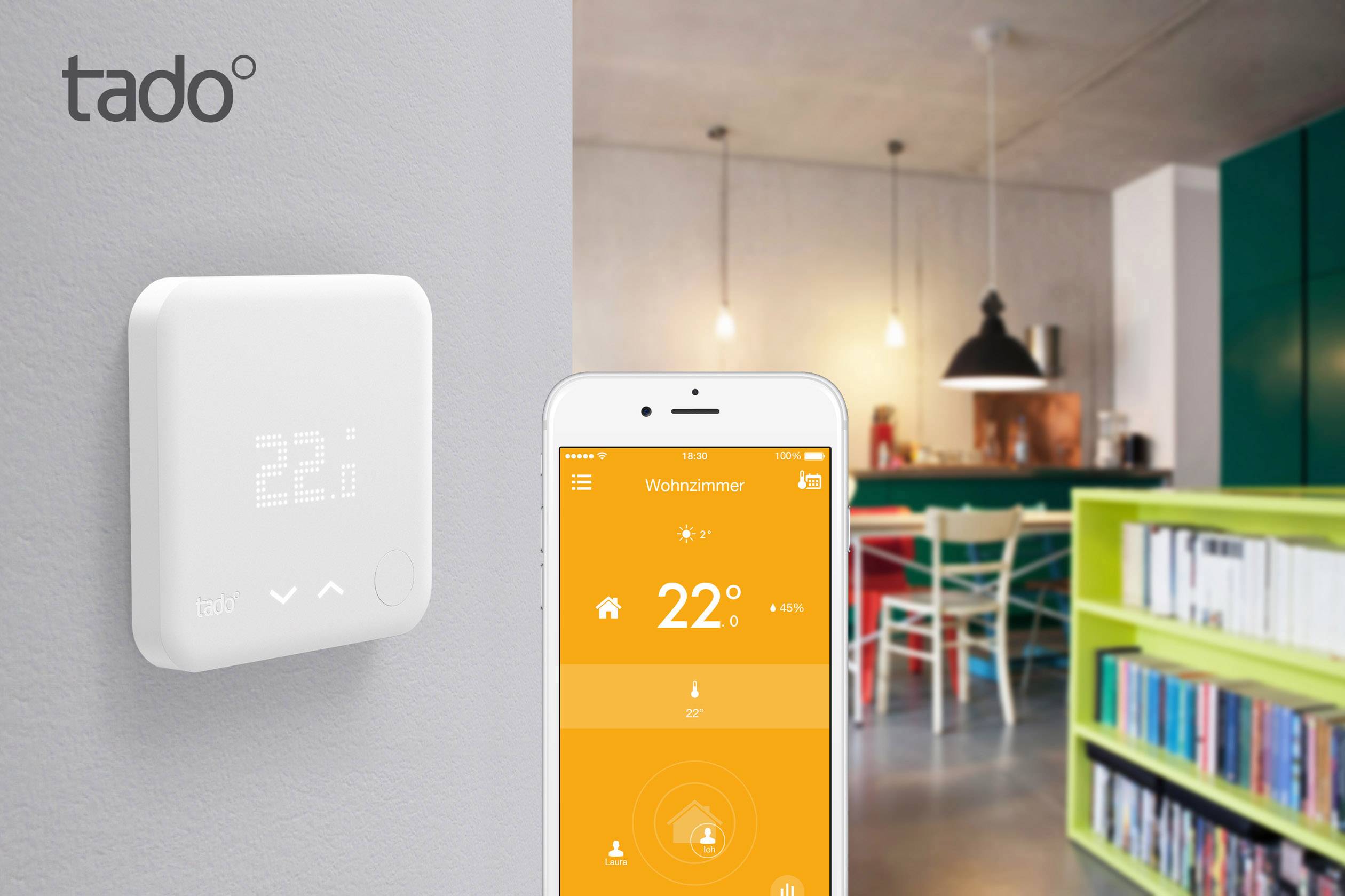 Das smarte Thermostat von tado° steuert deine Heizung ortsabhängig via Smartphone App Jetzt das Starter Kit bestellen und bis zu 31% Heizkosten sparen!. Unser neues Smartes Thermostat Starter Kit (V3) ist da Mehr Komfort, leichtere Bedienung und PlattformKonnektivität Mit der tado° Einzelraumsteuerung und dem verbesserten Regelalgorithmus lässt es sich noch komfortabler heizen und mehr Geld sparen. Starter Kit Smart Radiator Thermostat V3 If you only have radiator valves, you can make your heating intelligent Just replace your old valves with tado° Smart Radiator Thermostats and connect them to the internet via the included tado Internet Bridge.