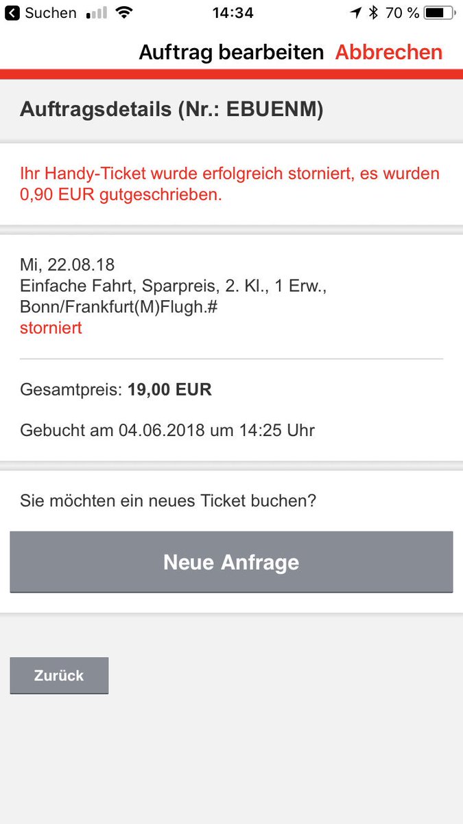 Je nach Tarifoption können Sie Ihr Ticket direkt online umtauschen oder stornieren So geht's 1 Direkt online auf der Website von OUIsncf via "Ihre Buchungen" oder via "Meine Reisen" in der App 2 Über das Kontaktformular innerhalb von 60 en Hierfür auf "Meinen buchungen folgen" und dann "Umtausch und Stornierung" klicken und den. Stornieren eines DBSparpreis Ticket am ersten Geltungstag Ein Sparpreis Ticket kann bei uns am 1 Geltungstag nicht storniert werden Wenn Sie allerdings am Reisetag ein Problem haben, können Sie über bahnde/auftragssuche eine Rückerstattung beantragen Sie müssen dafür eine Erstattungsbeschreibung machen. Dann solltet ihr das Bahnticket stornieren (Sparpreis, BahnCard 25) Bei Fragen zur Stornierung könnt ihr euch direkt an den Service der Deutschen Bahn wenden Diesen erreicht ihr unter.