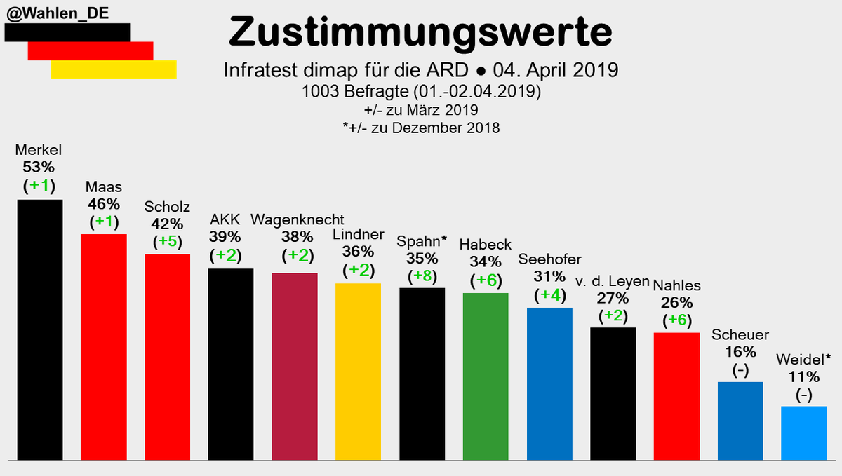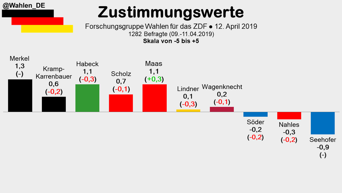Deutschland Wahlt در توییتر Zustimmungswerte Zu Wichtigen Politikern Vom 12 04 19 Skala Von 5 Bis 5 Merkel 1 3 Habeck 1 1 0 3 Maas 1 1 0 3 Scholz 0 7 0 1 Akk 0 6 0 2 Wagenknecht 0 2 0 1 Lindner 0 1 0 3 Soder 0 2 0 2
