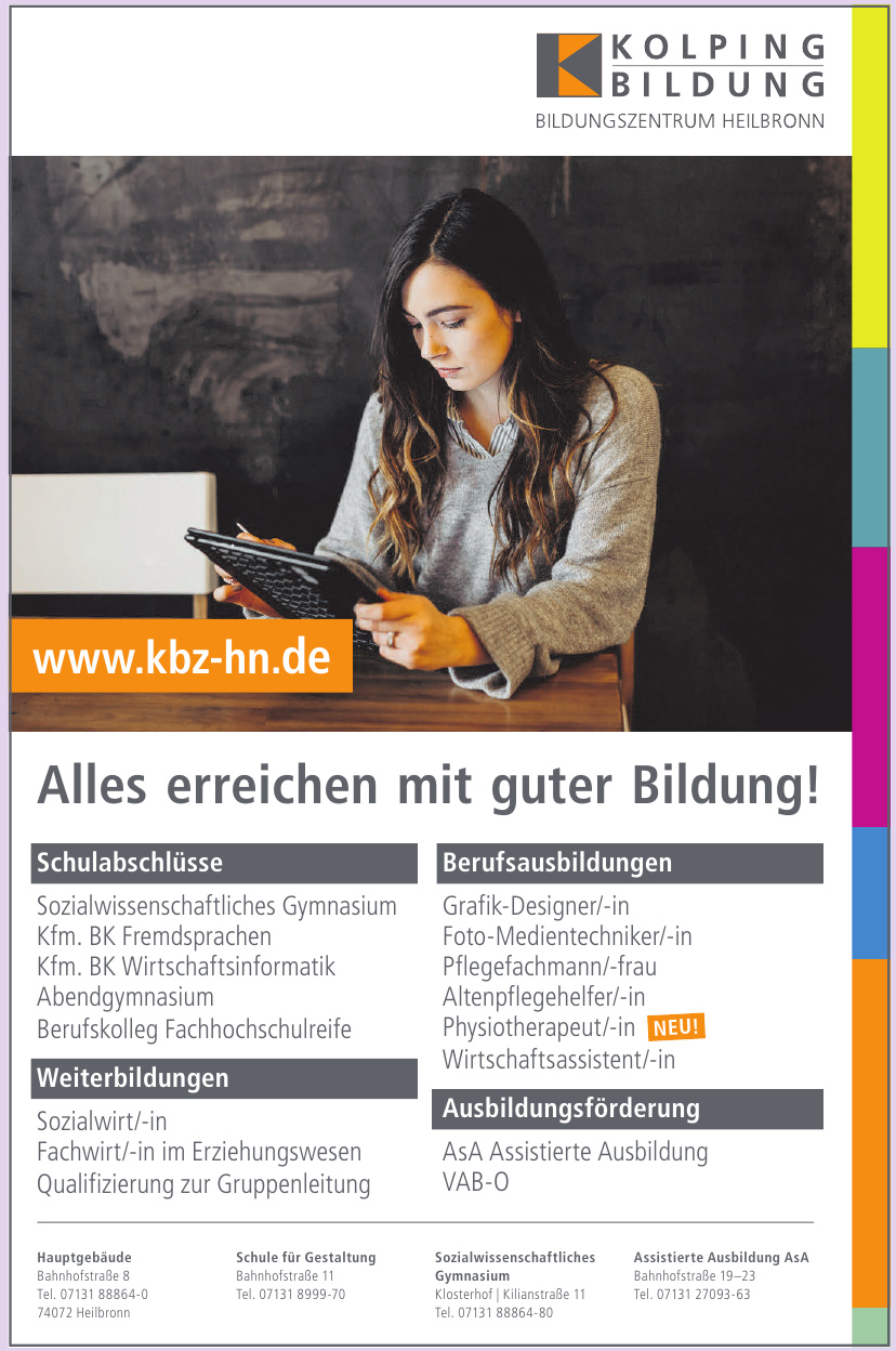 Dann bist du genau hier richtig Die IHK und die Handwerkskammer HeilbronnFranken helfen dir mit über 170 Bewerbungs bzw Kontaktadressen. Heilbronn@tricosgbrde wwwtricosbildungde USS GmbH Etzelstraße 34, Heilbronn Tel 5911 infohn@ussde wwwussde Kursart Allgemeiner Integrationskurs, Alphabetisierungskurs VDV Salzstraße 31, Heilbronn Tel 0172 info@vdvleonbergde wwwvdvleonbergde Kursart Allgemeiner Integrationskurs (auch abends. Bildung Die Spitzenleistungen der Unternehmen im Wirtschaftsraum Heilbronn werden nur durch gut ausgebildete und motivierte Arbeitskräfte möglich gemacht Um Nachwuchskräfte zu sichern und somit die Branchenvielfalt zu erhalten, wird in Heilbronn besonderer Wert auf Bildung gelegt.
