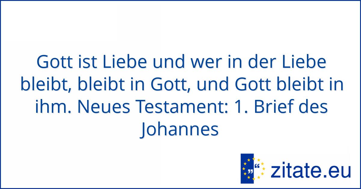 9 Liebe mit Gott 1 Joh 4, 16b Gott ist Liebe, und wer in der Liebe bleibt, bleibt in Gott und Gott bleibt mit ihm Im Johannesbrief wird der Halt an das Liebesgebot und an die Lehren Jesu deutlich Die Liebe zwischen zwei Menschen schließt immer einen Dritten, nämlich Gott, mit ein. Zum Thema Gott haben wir 272 Zitat (e)auf unserer Übersichtsseite für Sie zusammengetragen Jetzt stöbern und das passende Zitat finden!. Zitate und Sprüche über Liebe Liebe mich dann, wenn ich es am wenigsten verdient habe, denn dann brauche ich es am meisten ~~~ Unbekannt Es gibt nichts Schöneres als geliebt zu werden, geliebt um seiner selbst willen oder vielmehr trotz seiner selbst ~~~ Victor Hugo Was du liebst, lass frei Weitere Zitate.