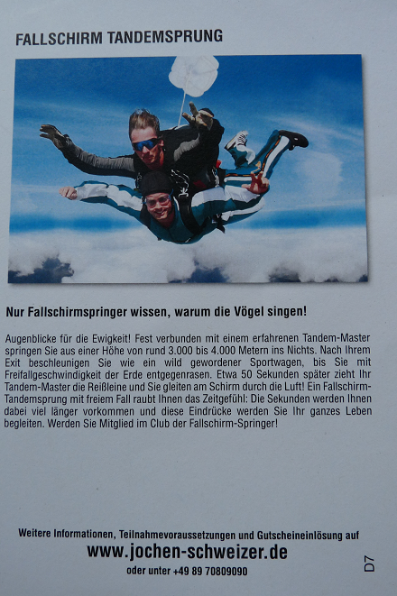 Jochen Schweizer Geschenkgutschein Fallschirm Tandemsprung Nur fallschirmspringer wissen, warum die vögel singen!. Jochen Schweizer Erlebnisse, München 172,453 likes · 34,960 talking about this Willkommen auf der offiziellen Fanpage von Jochen Schweizer Erlebnisse!. Bekommst du vor OrtTeilnehmer & Zuschauer Gutschein ist gültig für 1 Person Zuschauer herzlich WillkommenLeistung Tandemsprung aus 3.