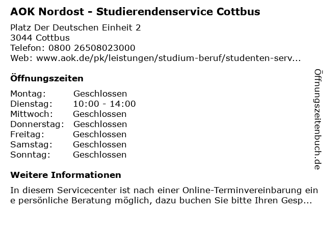 ᐅ Offnungszeiten Aok Nordost Studenten Service Tu Cottbus Papitzer Strasse 5 In Cottbus