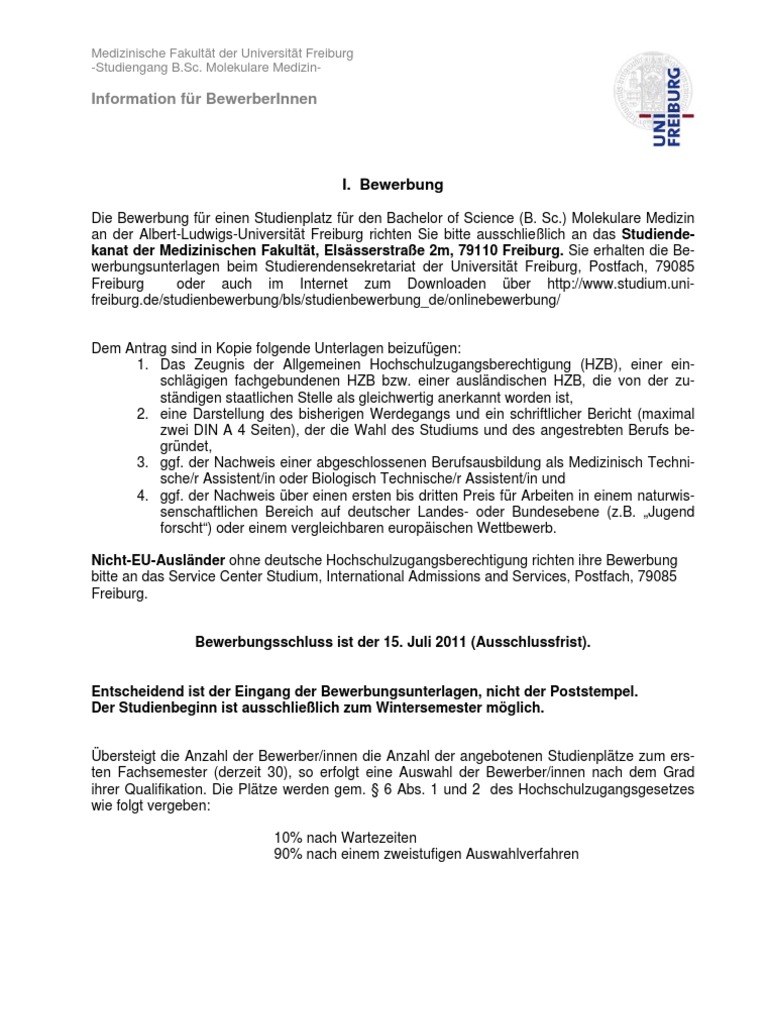 Deine Bewerbung für die Uni Freiburg Medizin (mit Universitätsklinikum Freiburg), Mathematik und Physik, Philologische Fakultät, Philosophische Fakultät, Rechtswissenschaft, Technische Fakultät, Theologie, Umwelt und Natürliche Ressourcen sowie Wirtschafts und Verhaltenswissenschaften Du kannst an der Uni Freiburg sowohl deinen. Medizinische Fakultät der Universität Freiburg Studiengang BSc Molekulare Medizin Information für Bewerber*innen I Bewerbung Die Bewerbung für einen Studienplatz für den Bachelor of Science (B Sc) Molekulare Medizin an der AlbertLudwigsUniversität Freiburg erfolgt online über das Bewerberportal der Universität Freiburg. Deine Bewerbung für die Uni Freiburg Medizin (mit Universitätsklinikum Freiburg), Mathematik und Physik, Philologische Fakultät, Philosophische Fakultät, Rechtswissenschaft, Technische Fakultät, Theologie, Umwelt und Natürliche Ressourcen sowie Wirtschafts und Verhaltenswissenschaften Du kannst an der Uni Freiburg sowohl deinen.