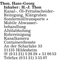 Firma Thon Inh H J Thon Hans Georg In Hildesheim Branche N Kanalreinigung Und Tv Untersuchung Sondermulltransporte