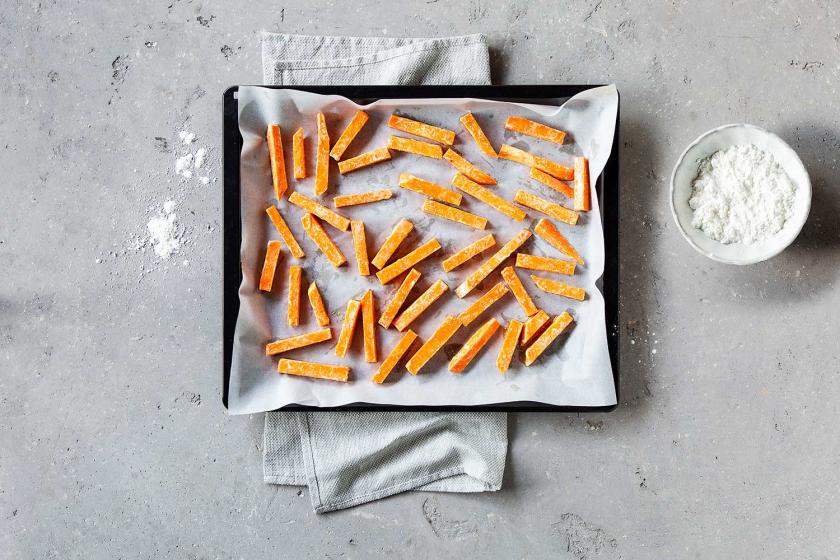 Für die Süßkartoffel Pommes die Kartoffeln schälen und in PommesStreifen schneiden In eine Schale geben und zirka 1 Stunde wässern Wasser abgießen und mit Küchenpapier oder Küchentuch abtrocknen Den Backofen auf 250 °C Ober/Unterhitze vorheizen und ein Backblech mit Backpapier belegen.